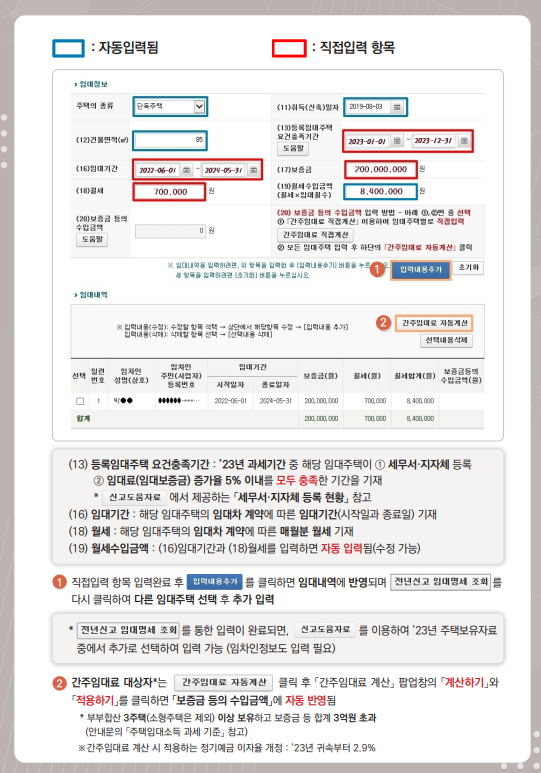 주택임대사업자는 다음 사항으 참고하여 사업자현황신고서를 작성하시기 바랍니다. 1. 간주임대료3주택 이상 보유자의 간주임대료 계산 시 정기예금 연 이자율이 3.5%로 상향되었습니다. 2. 주